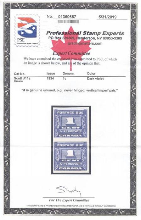 6772 J11a imageJ11a, Imperforate pair, rich fresh colour, full margins, VF, NH. Has 2019 PSE Certificate. Only 100 pairs exist (Image) (View Certificate)
