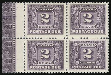 6769 J2 imageJ2, Very attractive left margin block with full TYPE A LATHEWORK. Deep rich colour, nicely centred. VF, OG, couple small thins in top pair. A SCARCE BLOCK. Cat $7,000 (Image) Estimate 1,500.00+ $Cdn