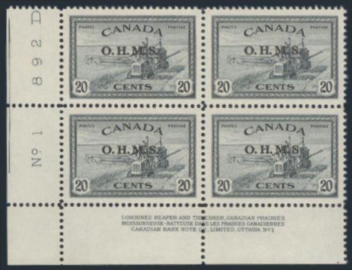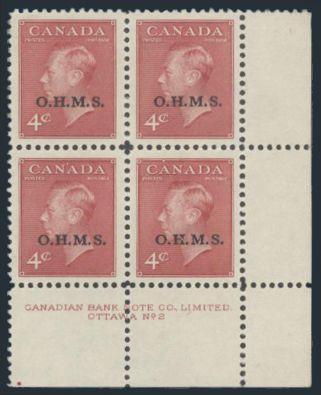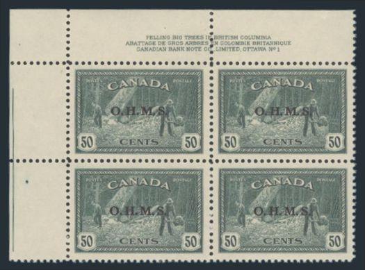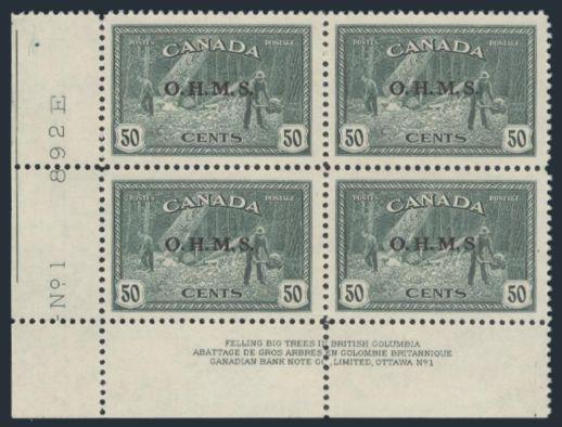 6806 O8a imageO8a, LL Plate #1 Block with the bottom right stamp (Pos 47) having the NO PERIOD AFTER "S" variety, perfectly centered, XF, NH (Image) Cat 300.00+