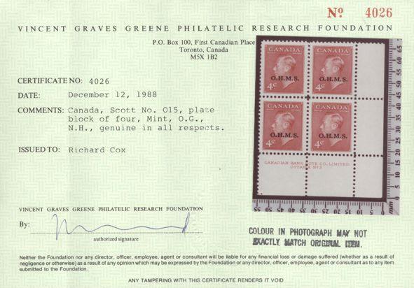 6816 O15 imageO15, LR Plate #2 Block, perfectly centered, XF, NH. Has 1988 Greene Foundation Certificate. A SCARCE POSITION AND IN TOP CONDITION (Image) (View Certificate)