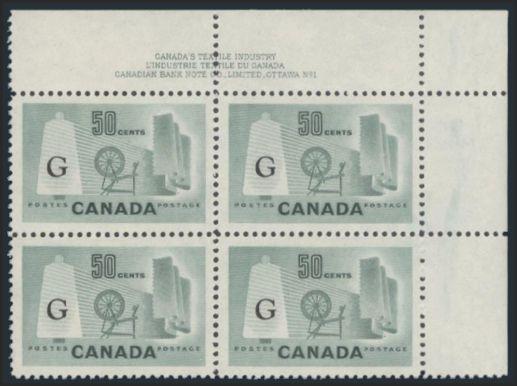6838 O38ai imageO38ai, UR Plate #1 Block of the 50¢ Textile Flying "G". The UR stamp has the rare FISHHOOK "G" variety. Fresh, VF, NH (Image) Cat 1,000.00