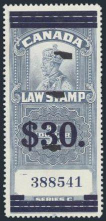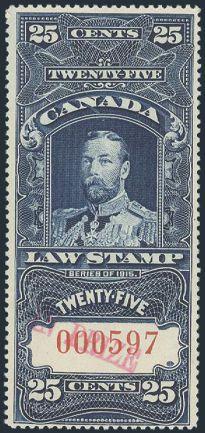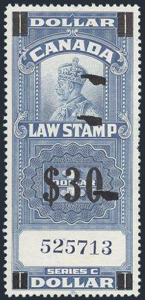 7009 FSC13 imageFSC13, Scarce KGV 10¢ Law Stamp, bright fresh colour, well centered. VF. Much nicer than one is accustomed to seeing (Image) Cat 1,000.00