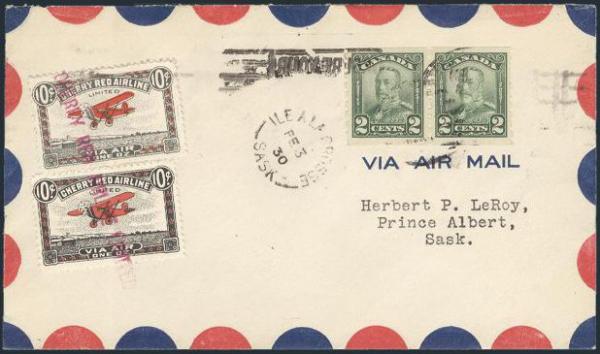 Cherry Red Airline normal & 'Snow on Wings' variety tied on FFC Ile a La Crosse to Prince Albert 3 Feb, 1930. VF (Image)