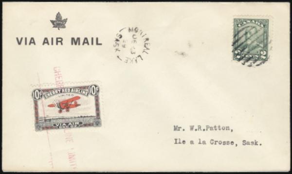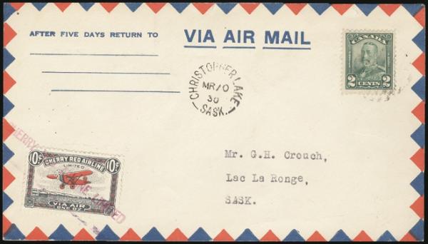 Cherry Red Airline tied on FFC Lac La Ronge to Christopher Lake 11 Mr, 1930. Has nice illustrated corner card. VF (Image)