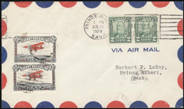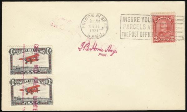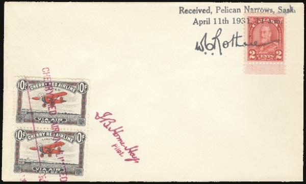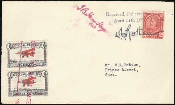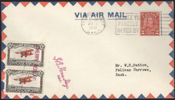 Pair), Cherry Red Airline Pelican Narrows to Prince Albert FFC 11 Apr 1931. Has PILOT SIGNED h/s. VF (Image)