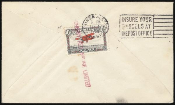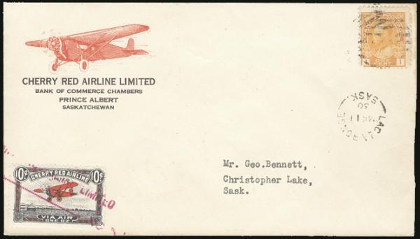 CL46a, Cherry Red Airline Serif on crossbar of "A" in "AIR" variety tied on Christopher Lake to Prince Albert 12 Mar 1930 FFC. VF (AAMC #CL46 - 3001c)