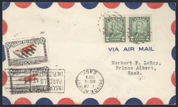 CL46i, Two copies incl regular and SNOW ON WINGS variety tied on Prince Albert/Lac La Ronge ROUND TRIP FLIGHT cover 10 Aug 1929. UNLISTED. VF (Image)