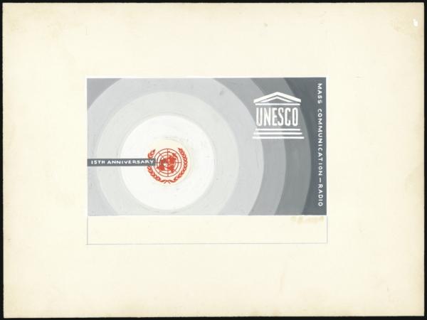 Attractive multi-coloured hand-painted illustration of proposed stamp issue by US Artist LAWRENCE FROELICH. Designed for the 15th Anniversary of UNESCO & depicts UN crest surrounded by concentric circles "Mass Communications - Radio", no denomination. Measures 7.5 x 9.75 inches. F, bit soiled towards edges (Image)