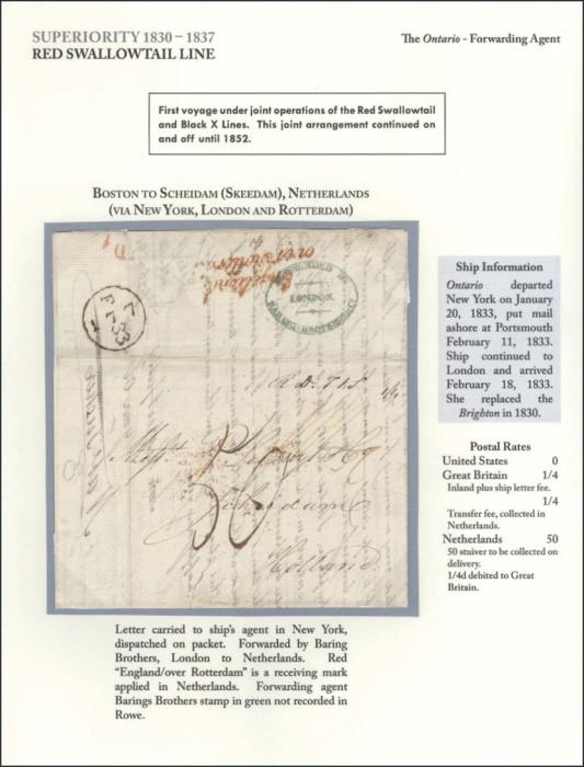 Stampless cover neatly written up on an Exhibition page carried aboard Red Swallowtail Line ship "The Ontario" from Boston to Scheidam, Netherlands via New York, London & Rotterdam. Has oval Baring Brothers, London forwarding agents & red "England / over Rotterdam" receiver b/s's. F-VF. Ex Pullin (Image)