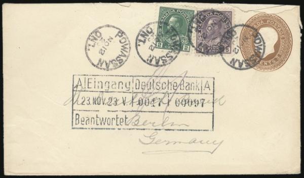 Interesting lot of covers & postcards franked by KGV Admirals, from 1913-31. All are addr to Gr. Britain; plus 5 diff European nations. Tremendous variety of cancels, frankings (both multi & single usages), rates, destinations, etc. Most VG-VF, odd flt. Most are from the Al Steinhart stock that was priced up 25-30 years ago. Old retail totals $1,100+ (33) (Image)