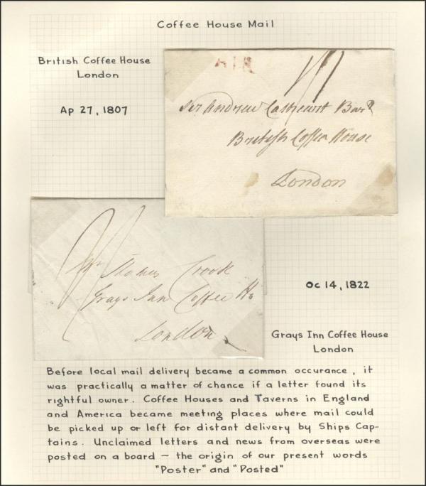 Two stampless COFFEE HOUSE MAIL covers neatly displayed & written-up on an album page. One is from 1807 addr to British Coffee House, London; other 1822 addr to Grays Inn Coffee House, London. Before local mail delivery became common, Coffee Houses & Taverns in England (& America) became meeting places where mail could be picked up or left for distant delivery by ships' Captains. F (Image)