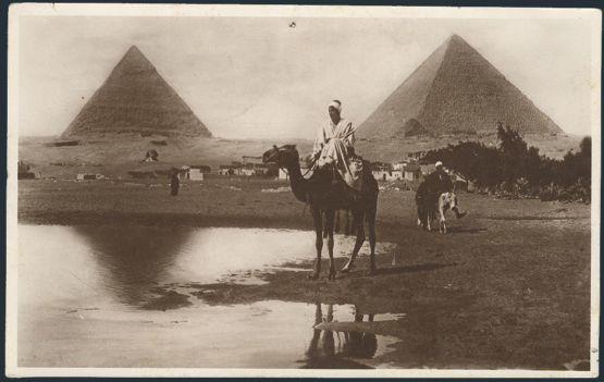 Binder full with a collection of Egypt postcards from 1900's-to later with b/w and coloured types (some real photo). Has both unused & used. These depict a wide variety of scenes incl pyramids, sphinx, temples, monuments, hotels, Cairo, Luxor, Thebes, Karnak & more. F (150 postcards) (Image)