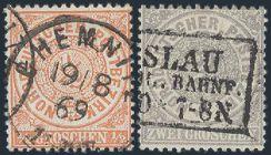1/O5, Two double-sided stockcards full with an accumulation of used 1868-70 issues with varying duplication. Contains a range of shades and all kinds of nice cancels incl CDS's, dated, boxed, etc. Also one 1868 Postal Stationery envelope from Pitschen. VG-VF. 2026 Scott $1,090 (247) (Image)