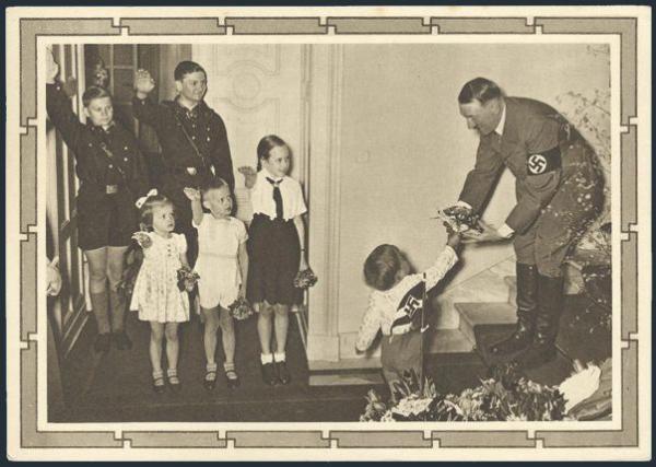 Interesting accumulation of Nazi Germany cover / postcards from the 1930's-40's. Has a wide range of single & multiple frankings; cancels; domestic mail; covers to USA, France, Chile, Newf'd; Postal Stationery incl 2 postal cards depicting ADOLF HITLER; 3 b/w postcards from Berlin 1936 Olympics; anti British 1941 postcard depicting a cracked battleship over Winston Churchill's head; 3 WWII Feldpost letters / card 1942-4 with enclosures; etc. High retail value with numerous $20, $25, $30, $50 items. VG-VF (47) (Image)