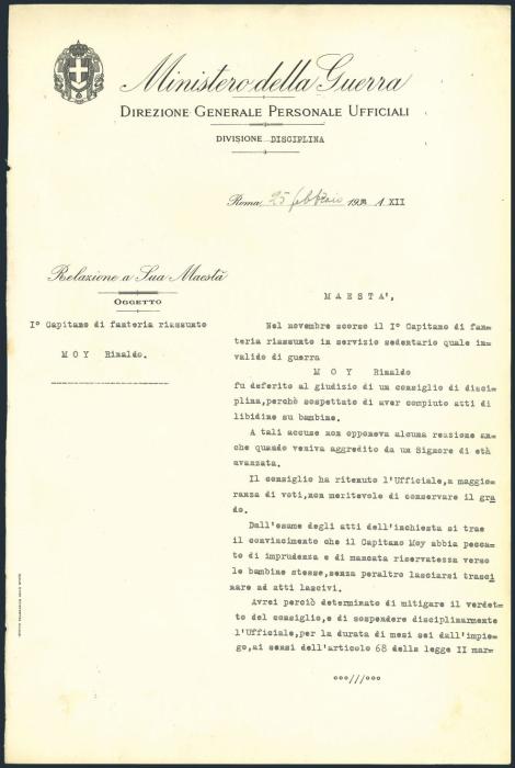 Large size (approx 9½ x 14½ inches) Ministry of War disciplinary document dated in Rome 25 Feb, 1934 and signed on the reverse by BENITO MUSSOLINI while he was Prime Minister. The disciplinary document details accusations of a Captain's lewd acts towards young girls. We saw a similar document signed by Mussolini being offered on eBay for $994 US. F-VF. A wonderful historical item! (Image)
