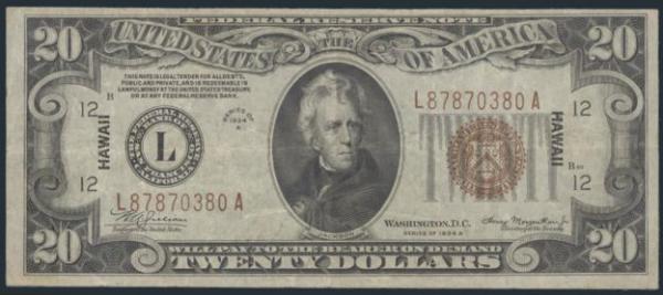 $20 HAWAII NOTE: United States 1934 Federal Reserve $20 note with emergency "HAWAII" overprint. These notes were overprinted after the attack on Pearl Harbour to thwart a possible Japanese invasion of the islands. VF (Image)