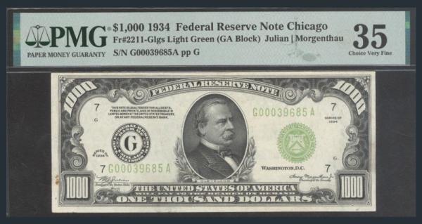 $1,000 NOTE: Federal Reserve Bank of Chicago $1,000 Note from 1934 with bust of Grover Cleveland and signed by Julian & Morgenthau. VF. Has been PMG Certified & graded 35, small bit of ink stains on reverse and a few rust marks. A scarce