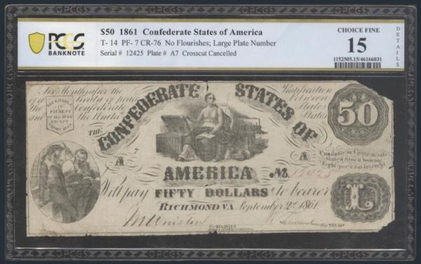 CONFEDERATE STATES $50 NOTE: Confederate States of America $50 note from 1861. F, edge damage, small edge tear and crosscut cancelled. Has been PCGS Certified & graded "15" (Image)