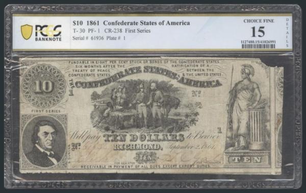 CONFEDERATE STATES $10 NOTE: Confederate States of America $10 note from 1861. F, missing corner, edge tears, minor rust, minor pencil. Has been PCGS Certified & graded "15" (Image)