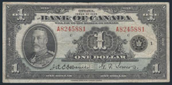 CANADA $1 PAPER MONEY 1935: Circulated $1 Paper Money note from 1935 signed by Osbourne & Towers. F (Image)