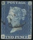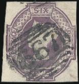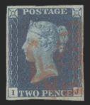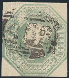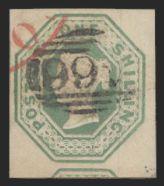 Shilling embossed. A GEM OF A STAMP. Has massive margins all around showing a portion of the adjoining stamp at bottom, fresh rich colour, neat postmarks, XF. AN OUTSTANDING EXAMPLE (Image)