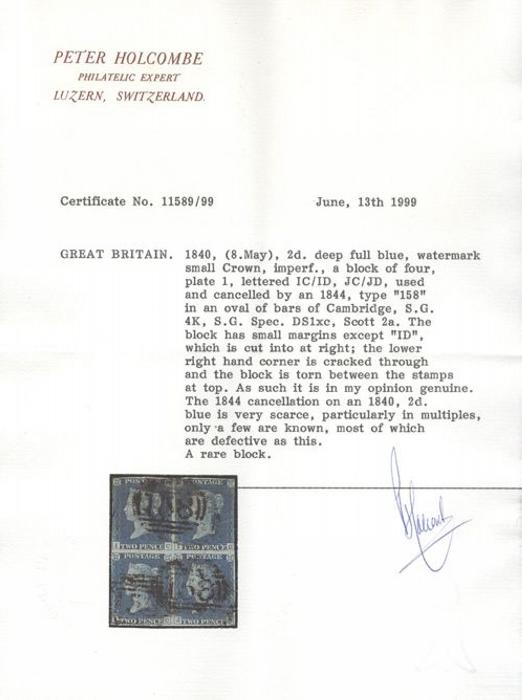Rare used block, rich colour, neat 1844 type '158' oval bars cancels of Cambridge, mostly clear margins, F, tear at top, one faulty corner. Has 1999 Holcombe Certificate. Scott $26,000 US. VERY SCARCE BLOCK (Image) (View Certificate)