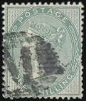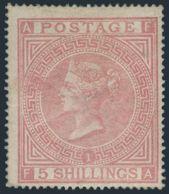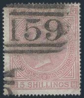 QV Five Shilling, neat '159' numeral cancel, F, corner crease. Cat $1,750 (Image)