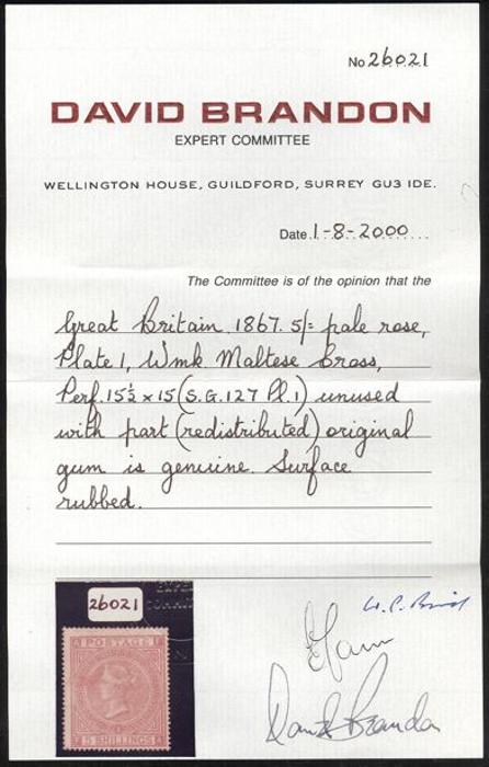 Rare QV 5 Shilling mint, F, OG which is partially redistributed, minor surface rubbing. Has 2000 Brandon Certificate (Image) (View Certificate)
