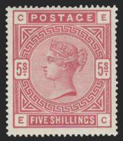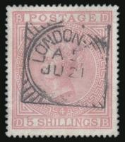 1076 90a image90a, Scarce QV Five Shilling on white paper. Beautiful centering, neat London squared circle cancel. XF, light thin. Cat $6,150 (Image) Estimate 1,250.00+ $Cdn