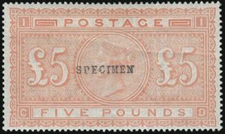 1078 93 image93, QV Five Pound Orange mint with "SPECIMEN" overprint. Beautifully centred, rich colour. VF, OG, light crease. A NICE LOOKING EXAMPLE OF THIS RARITY. (Normal stamp Cat $14,500 US) (Image) Estimate 2,500.00+ $Cdn