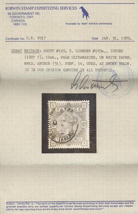 1091 109 image109, QV Ten Shilling High Value, beautifully centered, fresh rich colour, VF, OG (Image) Cat 2,625.00