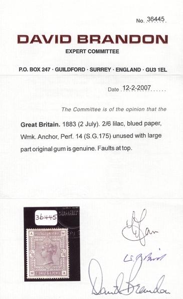 1084 96a image96a, Rare example of the QV 2sh6p Lilac on BLUED PAPER. Well centered, nice colour. VF, OG, slight flaws at top. Has 2007 Brandon Certificate. A CLASSIC RARITY. Cat $8,750 (Image) (View Certificate)
