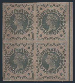 1096 111 image111, Sheet margin imperf PLATE PROOF block of the QV Halfpenny, in blue green on buff paper. VF, usual natural paper imperfections. Scarce (SG #K28 Proof, Cat £880) (Image) Estimate 600.00+ $Cdn