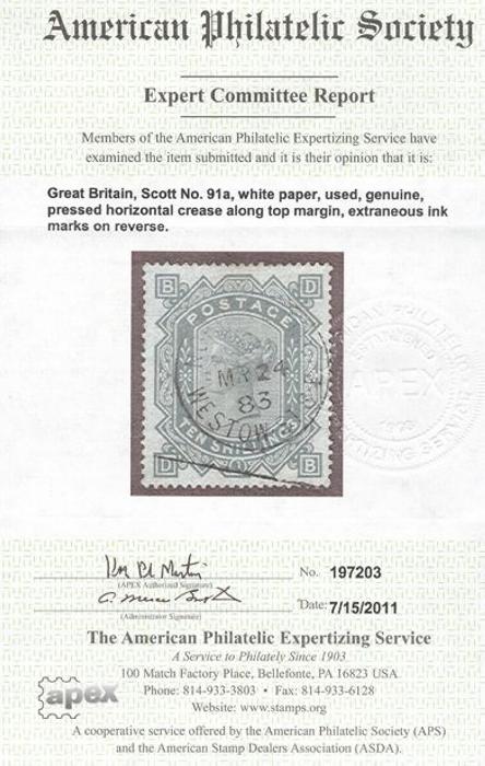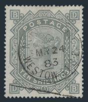 1077 91a image91a, QV Ten Shilling on white paper, perfect centering, rich colour, neat Norwood D.O. / Westow St. SE 24 Mar 1883 CDS cancel. VF, light pressed crease in top margin, a few ink marks on reverse. Has 2011 APS Certificate (Image) (View Certificate)