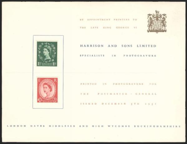 Two diff QE Wildings hinged on souvenir card from Harrison & Sons Ltd from 1952. Illustrated & embossed with British Coat of Arms. VF. Attractive collectable (Image)