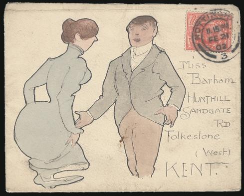 by Nottingham 21 Feb 1902 CDS on cover to Folkestone (22 Feb b/s). Depicts multi-colour HAND PAINTED / ILLUSTRATED caricature of a man in a discussion with a lady; both well dressed in period style. F-VF, bit soiled. Eye-catching (Image)