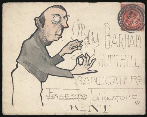 by Nottingham 26 Mar 1903 CDS on HAND PAINTED / ILLUSTRATED cover to Folkestone, 27 Mar b/s. Depicts google-eyed magician pulling the address from a small sphere in a smoke-like manner. F, trivial flaws, slight soiling (Image)