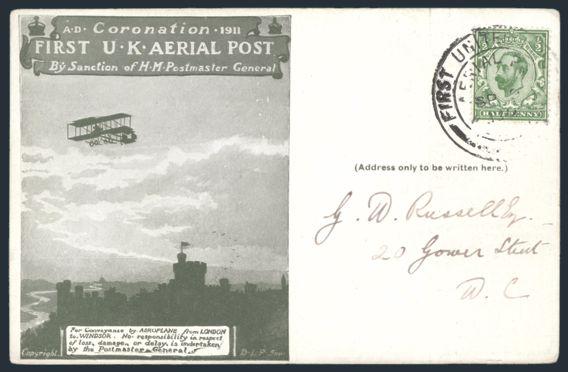 by 9 Sep 1911 special cancel on a postcard for FIRST UK AERIAL POST with olive green cachet. F-VF (Image)