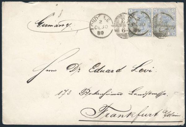 Pair tied by London 30 Dec 1880 duplex cancels on cover to Frankfurt 31 Dec (New Years Eve) b/s. F (Image)