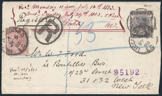 Tied by Ludgate House 5 July 1883 CDS's on Reg'd Trans-Atlantic cover to New York. Has interesting large magenta "JUL / 15 83 / in D" New York receiver b/s. F-VF, slightly reduced (Image)