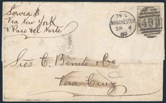 by Manchester 4 Sept 1889 duplex cancel on Trans-Atlantic folded cover to Vera Cruz (Mexico) with rec b/s. Has m/s notation "Servia $ / Via New York / & Paso del Norte". F, some cover toning. Scarce franking (Image)