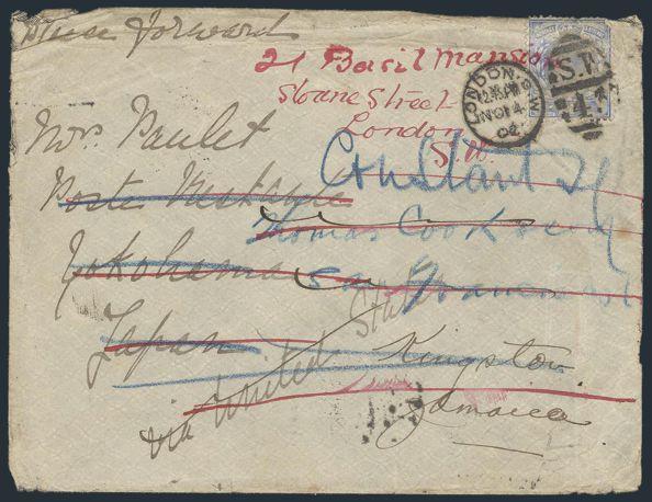 Each tied by London or Warwick 1902 cancels on covers addr to YOKOHAMA, JAPAN. Two are redirected (via New York & San Francisco) to JAMAICA. One redirected again back to London. One has Thomas Cook & Son, NY forwarding label affixed. Very mixed