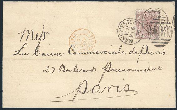 Bluish paper tied by Manchester 6 My, 1876 duplex cancels on cover to Paris (rec b/s). Has Calais entry cancel. VF. Cat $225 (Image)