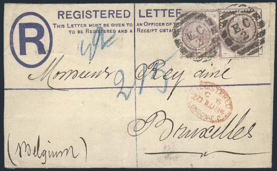 Tied on a QV Registered Letter Postal Stationery envelope with 2 Pence imprint from London 20 Aug 1884 to Brussels Belgium (rec b/s). F (Image)