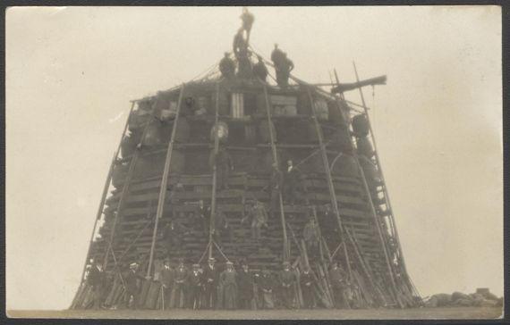 by Ulverston 8 July, 1911 CDS on b/w real photo postcard. Depicts an enormous wooden pile being built for a bonfire for the 1911 Coronation of KGV. VF. A MOST UNUSUAL POSTCARD!
