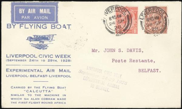 by Liverpool 24 Sept 1928 CDS's on cacheted EXPERIMENTAL FLYING BOAT cover from Liverpool to Belfast. VF (Image)