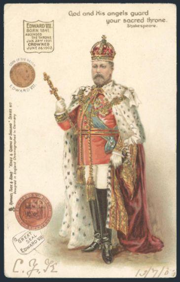 by 13 July, 1903 CDS on coloured Coronation postcard depicting KE in full regal dress. F, small corner crease (Image)