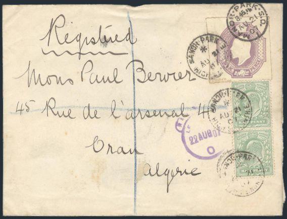 Plus KE 6d Postal Stationery cut square tied by Manor Park & Sandr. Park 21 Aug 1907 CDS's on Reg'd cover to ALGERIA. F. Nice foreign destination cover with unusual franking