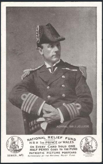 photo patriotic postcard issued for the NATIONAL RELIEF FUND. Depicts a portrait of ADMIRAL SIR J. JELLICOE. He commanded the Grand Fleet at the Battle of Jutland & later became First Sea Lord. Has pictures of a 1914 Half Penny copper coin at bottom