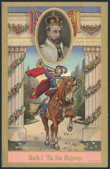 Bamforth coloured Coronation postcard circa 1912 depicting a portrait of KGV along with a medieval horse rider with trumpet with caption "HARK! TIS HIS MAJESTY". VF